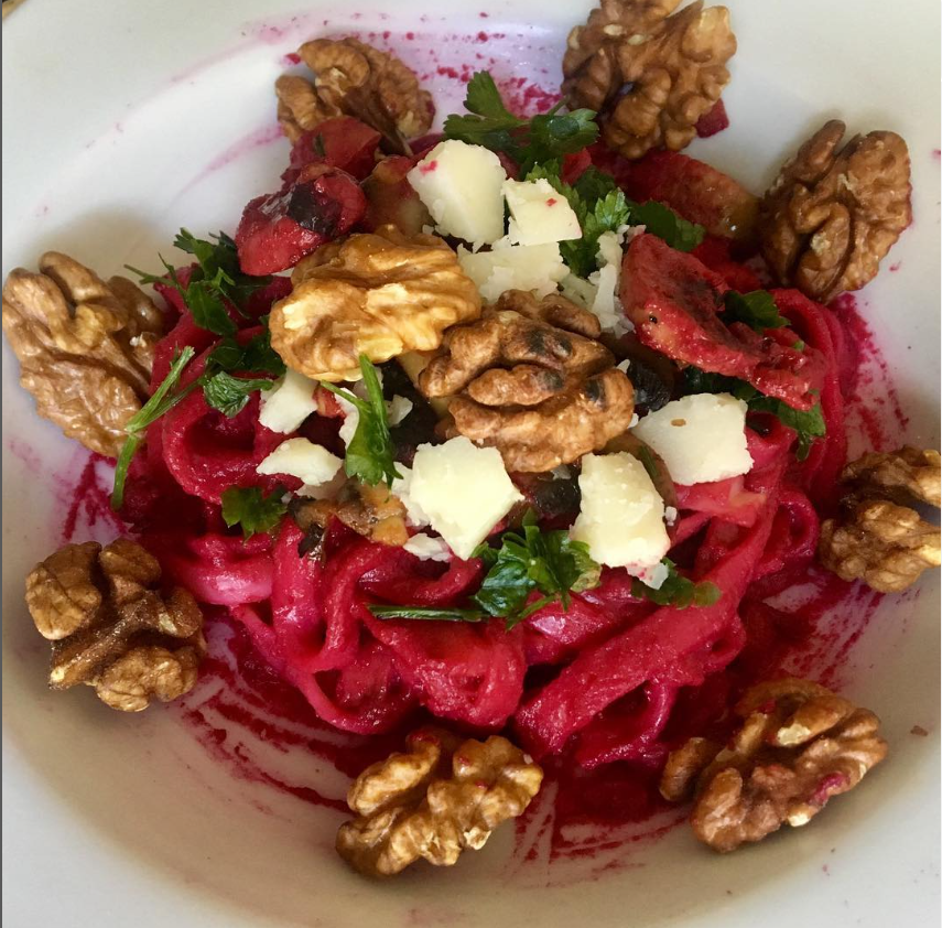 - Dry roasts the walnuts and add them with the garlic and beets in a blender. You may make it into a juice like a watery mix or simply keep it grainy. Add the salt, pepper and lemon juice and fix the tastes.